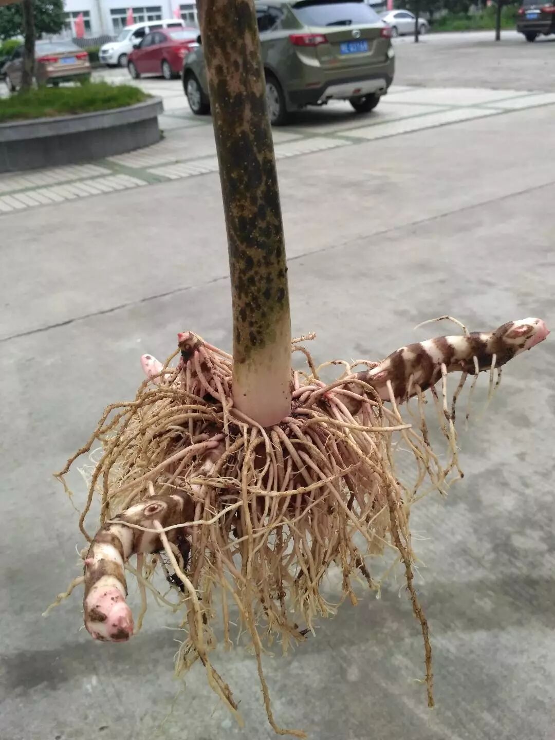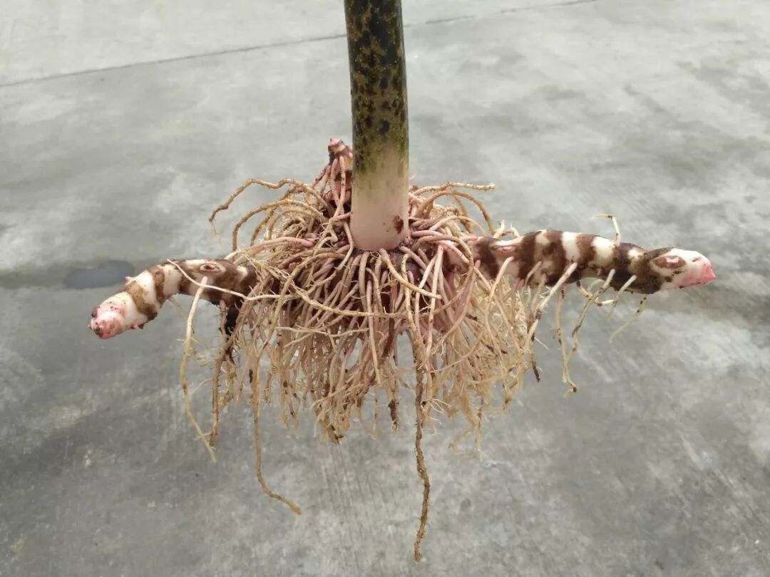 通过图片我们可以清楚地看到,魔芋的根遍布整个魔芋块茎的中上部,尤其以植株苗周围最繁密,芋鞭则完全集中在魔芋球茎的上部,分布在植株苗的周围,并且是横向水平延伸生长 。