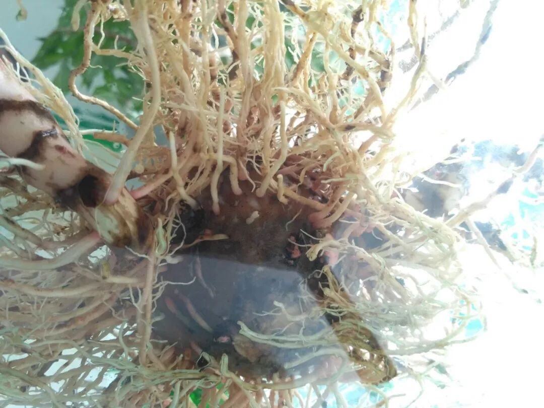 魔芋的植株芽开始生长的时候,会有大量的根和芋鞭从植株芽周围同时生长出来。